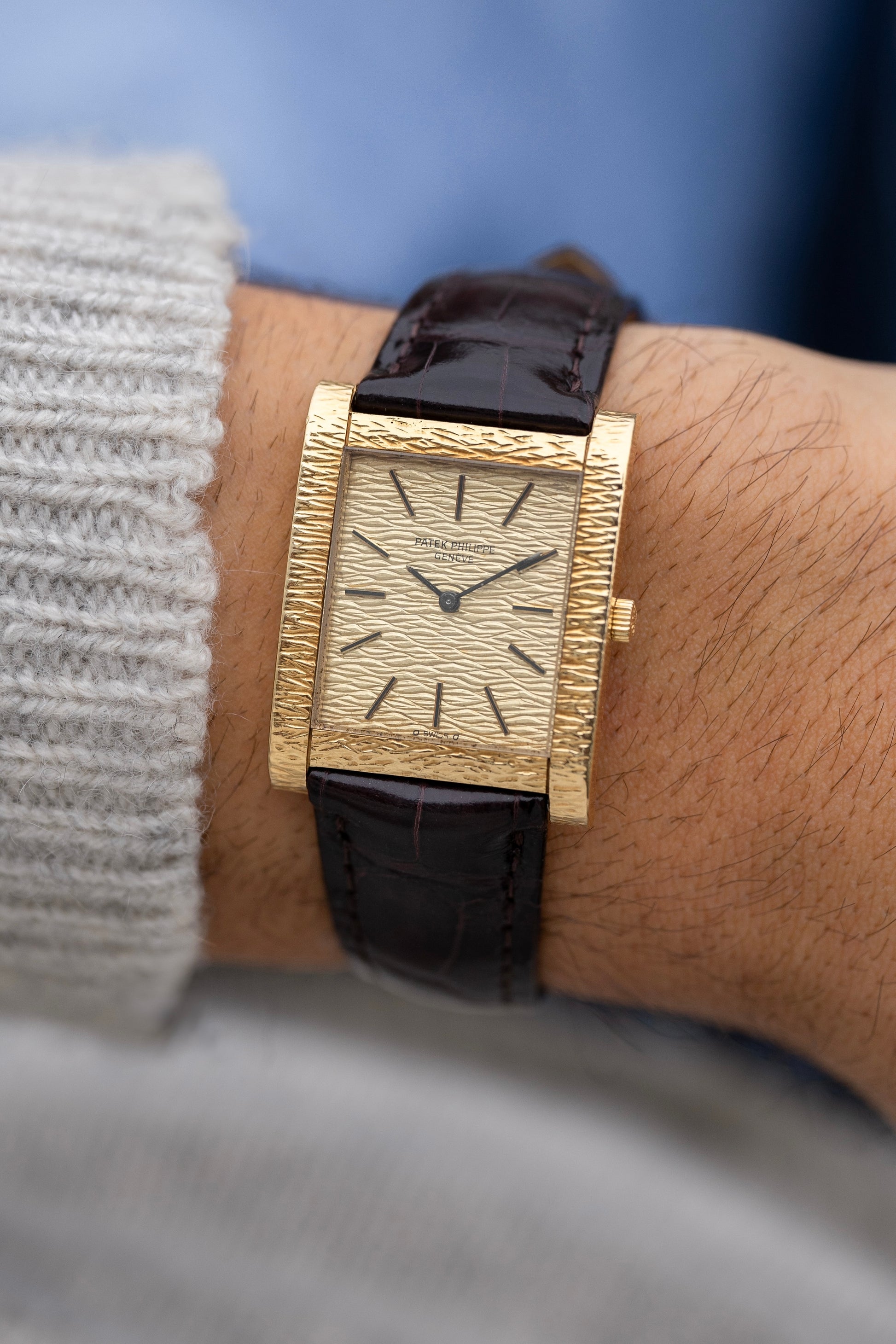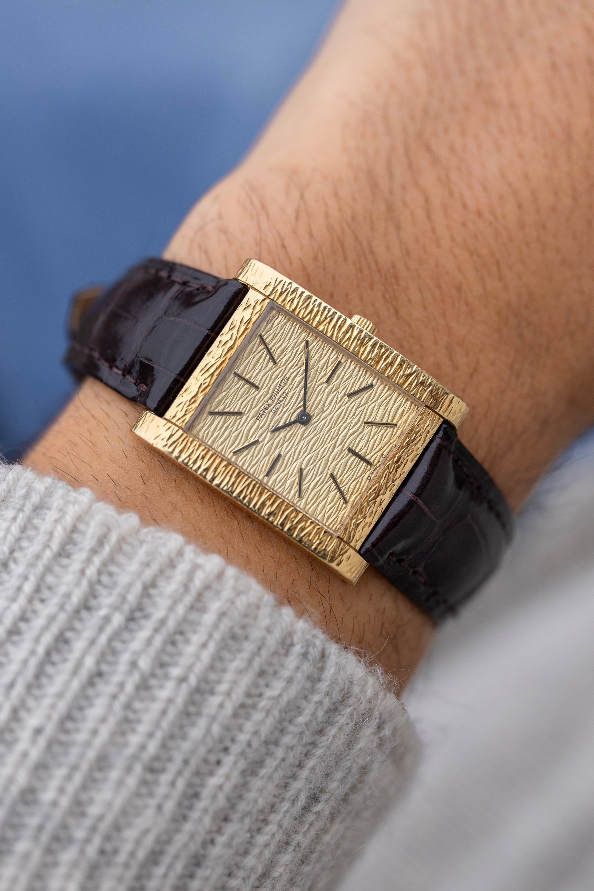 De Patek Philippe Gondolo referentie 3553J, geïntroduceerd aan het einde van de jaren 1960, is een voorbeeld van de voorkeur van die tijd voor gedurfde texturen en onderscheidende ontwerpen, terwijl het de tijdloze elegantie behoudt die geassocieerd wordt met Patek Philippe. Dit horloge is vervaardigd uit 18k geelgoud en heeft een unieke schorsstructuur die zich uitstrekt over de rechthoekige kast, de wijzerplaat en, in sommige versies, de geïntegreerde armband. Deze verfijnde afwerking creëert een samenhangende esthetiek die het meticuleuze vakmanschap weerspiegelt en biedt een tactiele, sculpturale kwaliteit die zelden te zien is in de horlogemakerij.